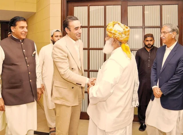 Earlier in the day, a PPP delegation led by Chairman Bilawal Bhutto Zardari – and comprising former prime minister Raja Pervez Ashraf, Nayyar Hussain Bukhari, and PPP Kashmir President Chaudhry Yasin – arrived at Maulana Fazlur Rehman’s residence. The JUI-F chief was accompanied by his son, Maulana Asadur Rehman.
